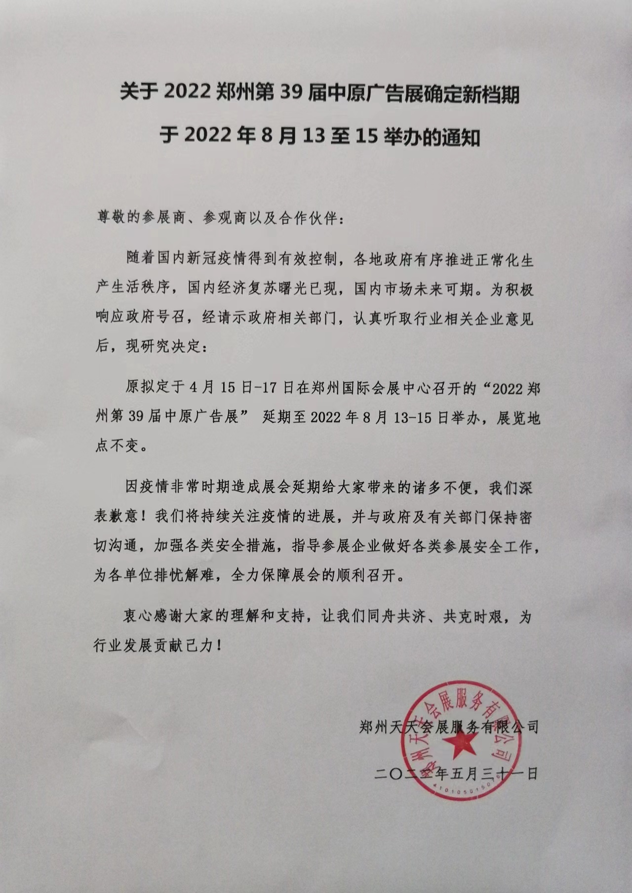 關(guān)于2022鄭州第39屆中原廣告展于2022年8月13-15日舉辦的通知